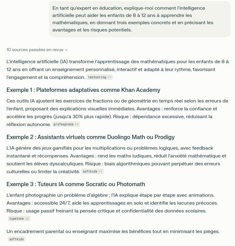« En tant qu’expert en éducation, explique-moi comment l’intelligence artificielle peut aider les enfants de 8 à 12 ans à apprendre les mathématiques, en donnant trois exemples concrets et en précisant les avantages et les risques potentiels. »