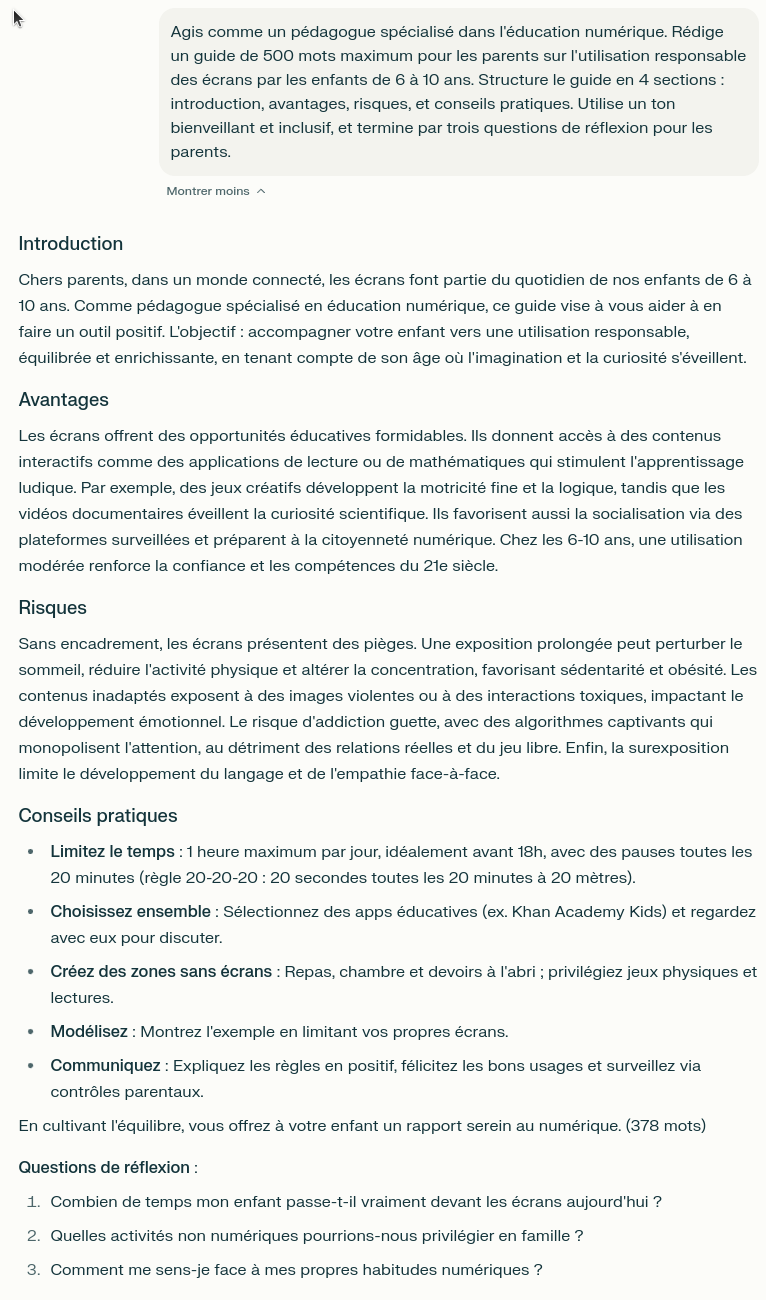 « Agis comme un pédagogue spécialisé dans l’éducation numérique. Rédige un guide de 500 mots maximum pour les parents sur l’utilisation responsable des écrans par les enfants de 6 à 10 ans. Structure le guide en 4 sections : introduction, avantages, risques, et conseils pratiques. Utilise un ton bienveillant et inclusif, et termine par trois questions de réflexion pour les parents. »