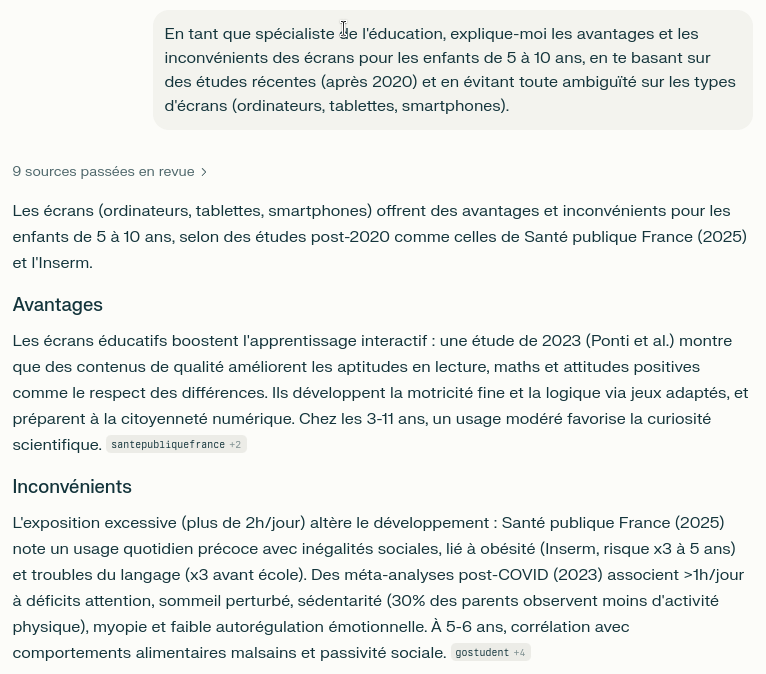 « En tant que spécialiste de l’éducation, explique-moi les avantages et les inconvénients des écrans pour les enfants de 5 à 10 ans, en te basant sur des études récentes (après 2020) et en évitant toute ambiguïté sur les types d’écrans (ordinateurs, tablettes, smartphones). »