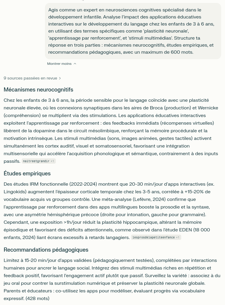 « Agis comme un expert en neurosciences cognitives spécialisé dans le développement infantile. Analyse l’impact des applications éducatives interactives sur le développement du langage chez les enfants de 3 à 6 ans, en utilisant des termes spécifiques comme ‘plasticité neuronale’, ‘apprentissage par renforcement’, et ‘stimuli multimédias’. Structure ta réponse en trois parties : mécanismes neurocognitifs, études empiriques, et recommandations pédagogiques, avec un maximum de 600 mots. »
