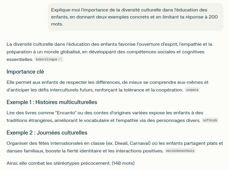 Pour pratiquer cette analyse, testez et ajustez ce prompt intermédiaire : « Explique-moi l’importance de la diversité culturelle dans l’éducation des enfants, en donnant deux exemples concrets et en limitant ta réponse à 200 mots. »