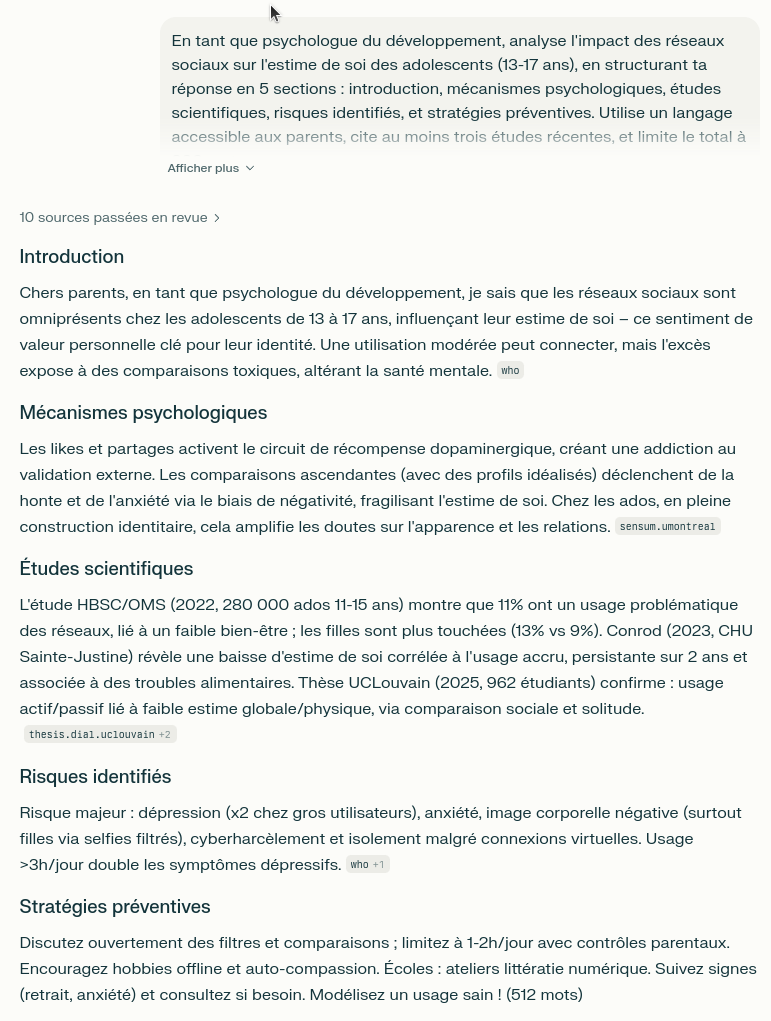 Pour appliquer cette méthode avancée, testez ce prompt complexe et recueillez des feedbacks : « En tant que psychologue du développement, analyse l’impact des réseaux sociaux sur l’estime de soi des adolescents (13-17 ans), en structurant ta réponse en 5 sections : introduction, mécanismes psychologiques, études scientifiques, risques identifiés, et stratégies préventives. Utilise un langage accessible aux parents, cite au moins trois études récentes, et limite le total à 800 mots. »